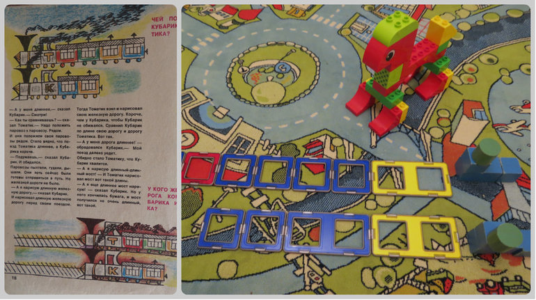 Во всех развивающих книгах есть задания и игры на изучение понятий "длинный - короткий", "длиннее-короче". Но при этом мы с Лёней не затрагивали собственно способ сравнения двух предметов по длине. Хотя как пишет Г.В.Сапгир, автор книги "Приключение Кубарика и Томатика или Веселая математика", умение правильно сравнивать не менее важно, чем сами понятия.