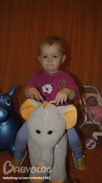 Умеем все что положено уметь к году: ходим, залазим на диван и слезаем, хлопаем в ладоши, собираем пирамидку, пытаемся собирать сортер, танцуем и много еще чего.
