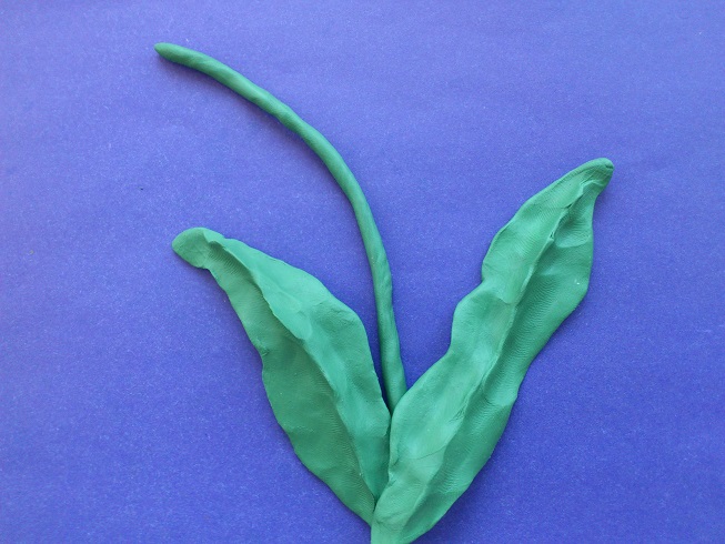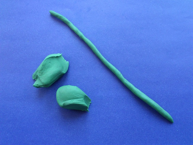 2. Отделите от подготовленного зеленого кусочка одну порцию для лепки стебля, и еще две - для листьев. Разомните массу в руках. Стебель вытяните в тонкую колбаску. Если в ваши планы входит лепка отдельного цветочка, то внутри стебля лучше замаскировать проволоку, чтобы готовое изделие было прочным.