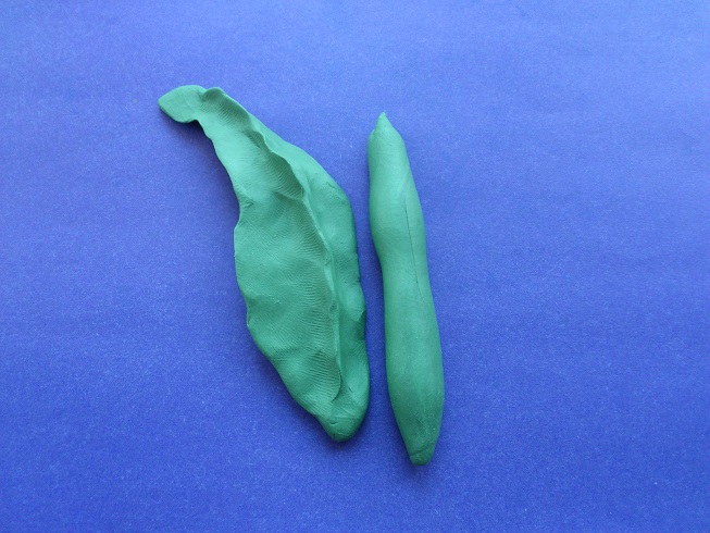 3. Массу, подготовленную для лепки листьев, начинайте вытягивать в колбаски, затем придавливать поверхность к твердой доске. Полученные лепешки должны быть шероховатыми, поверхность пластилина нет необходимости разглаживать. Сузьте пластилин с одной стороны. Затем, захватывая пластилин большим и указательным пальцами, сделайте продольный бугорок посередине.