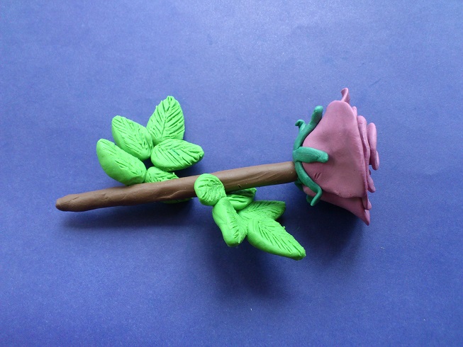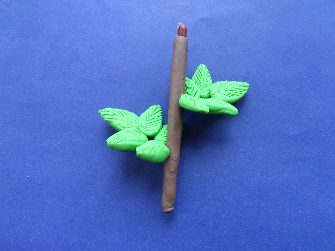 6. На подготовленную заранее палочку налепите тонким слоем коричневый пластилин. К полученному стеблю прикрепите листья.