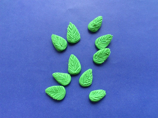 3. Придавите округлые кусочки к твердой доске пальцами, чтобы получить лепешку. Затем сдавите каждую заготовку по бокам так, чтобы получить каплеобразный листок. Стекой или каким-либо острым предметом нарисуйте на полученных деталях прожилки.