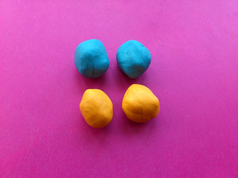 2. Обычно крылья у бабочек двойные, поэтому подготовим для их создания 4 шарика: 2 голубых и 2 оранжевых. Эти контрастные цвета будут красиво сочетаться.