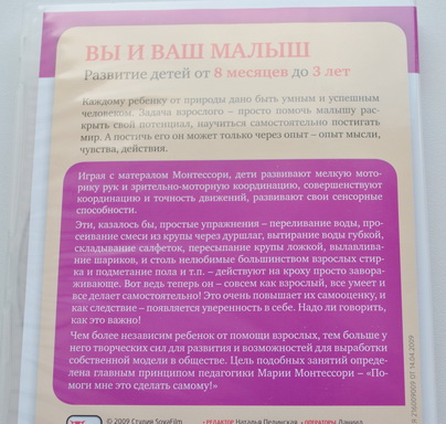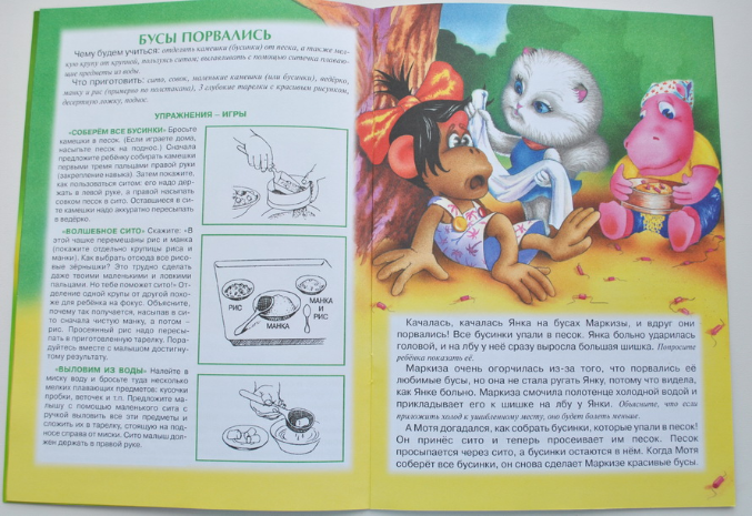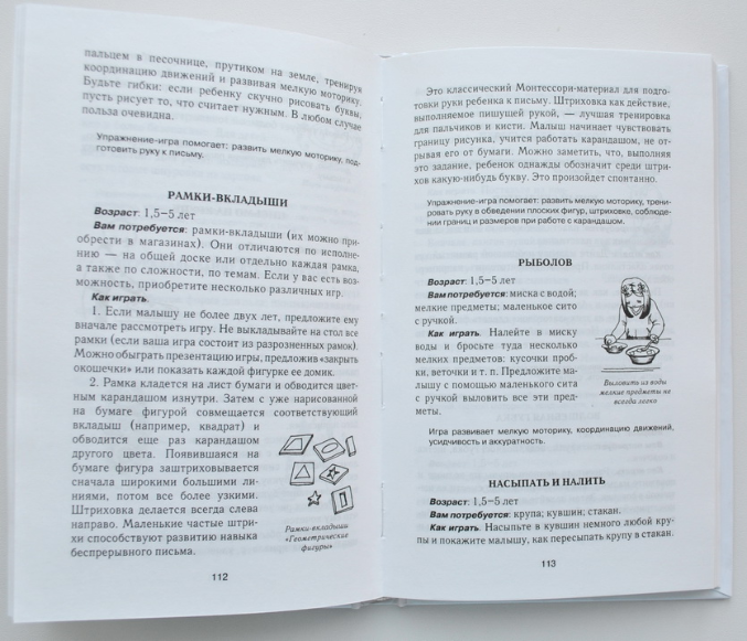 Книга практическая. Представлены упражнения в обыденной жизни: сортировка бусин по цветам, отделение ситом риса от манки, пересыпание крупы, взбивание мыла, вылавливание предметов из воды и проч.