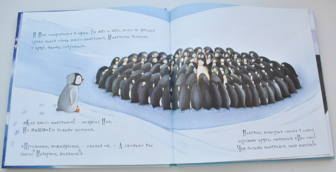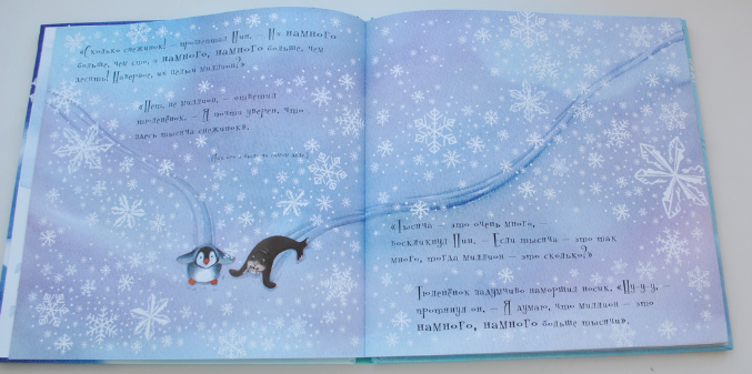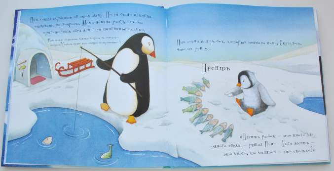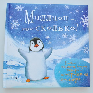 Это сказочная история, в которой маленький пингвиненок хочет узнать что такое миллион... Сначала ему демонстрируют 10 рыбок, потом 100 пингвинов, 1000 снежинок... Эта книга не научит считать, даст ребенку понятие "количества". Для детей 2-3 лет идеально, на мой взгляд. Года в 4 уже точно поздно будет.