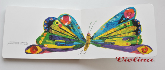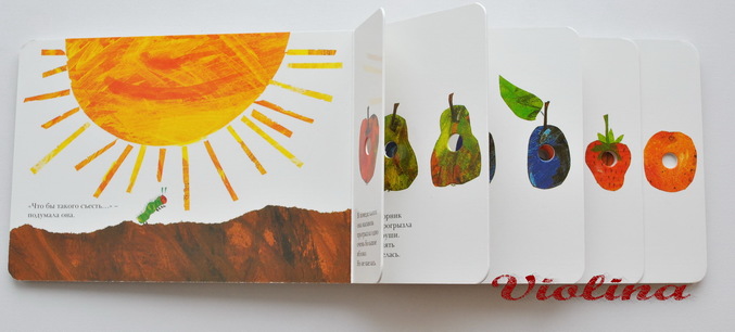 Причем книга, будучи очень короткой, является просто супер развивающей. Ребенок не только расширяет свой кругозор, знакомясь с процессом как из гусеницы появляется бабочка, но и узнает дни недели, счет до 5, названия фруктов. За счет разного размера страниц эта информация подается настолько наглядно, что просто диву даешься находчивости автора. А еще детки попутно любят теребить пальчиками дырочки в книжке, что стимулирует мышление и речь. Благодаря этой "фишке" ребенок не просто запоминает информацию, но и параллельно выстраивает логическую цепочку.