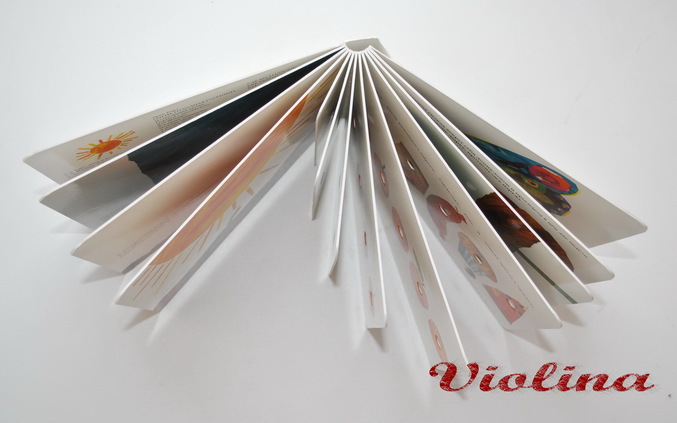 В книге представлены рисунки различных предметов разных цветов (зеленого, синего, желтого, оранжевого, голубого, красного, коричневого, розового, черного и белого). Книга с погремушкой из разноцветных колечек. Хороша для изучения цветов.