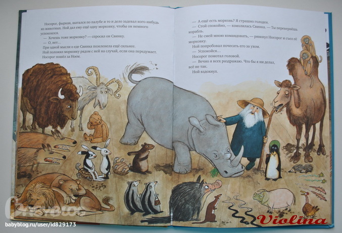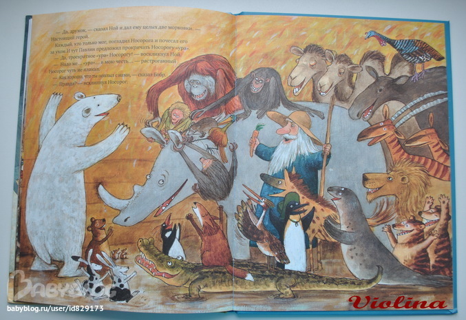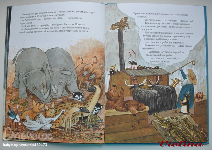Так о чем же книга? О построении правильных взаимоотношений. О том, что надо терпимее относится к недостаткам других. О ценности каждой личности, даже, казалось бы, вовсе не нужной и мешающей обществу. Есть там один такой герой - носорог. Казалось бы, самая "проблемная" персона. Сначала с ним было больше всего возни, чтобы поместить его на ковчег, потом возникло недопонимание со строны животных, почему ему достается вся вкусная морковка, затем он уже почти вывел всех из себя тем, что из-за тесноты расхаживал по ковчегу и раскачивал его - зверей же из-за этого одолевала морская болезнь. Этот носорог постоянно кого-то задевал, брюзжал и грубил. А в итоге, именно благодаря ему в самый ответственный момент ковчег уцелел и животные смогли выжить. Ведь именно он заткнул своим рогом пробоину в трюме, из-за которой корабль чуть не пошел ко дну. Хотя, по правде говоря, дело было вовсе не в геройстве носорога, а в стечении обстоятельств и смекалке (можно даже сказать хитрости) Ноя.