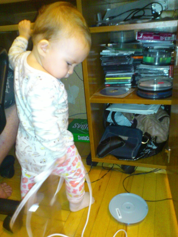 Маленькая хитрюля приноровилась открывать шкафчики и доставать оттуда вещи, а потом кидать на пол! Самое интересное, что когда наводишь после неё порядок - она тут же ползет обратно всё доставать! У неё явно другое представление о порядке!