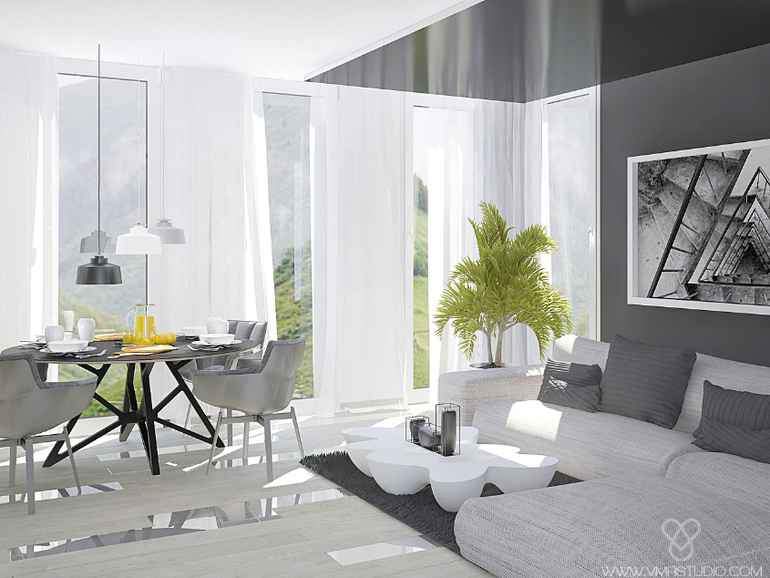 Начнем с гостиной, тут в качестве акцента мы используем настенные деревянные панели, это разбавит интерьер природным материалом и цветом, добавит тепла и контраста. Левее м можем увидеть коридор, ведущий в спальню, и стену , граничащую с гостевым санузлом. Стену мы обыграли, добавив дробящие направляющие из черного профиля, а так же "стеклянную заплатку", да, все верно, стена идет не до конца, а через стекло видно гостевой санузел (более подробно можно будет увидеть это на последующих 3D). Правее мы можем увидеть кухню, тут все довольно лаконично и просто, никаких ручек на фасадах! Зону кухни и столовую зону разделяет камин, в данном ракурсе его загораживает стол, но верхнюю часть все же можно увидеть :). Ах,да, наверняка возникнут вопросы по напольному покрытию: на массивная доска и стекло - это необычно, современно и добавляет интересную динамику нижней части интерьера.