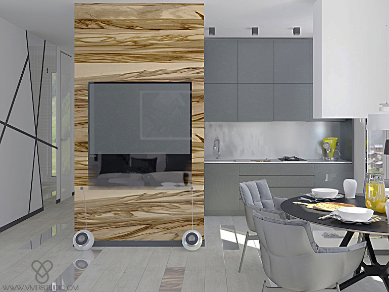 Задачу перед нами поставили довольно профильную для нашей студии: современно, интересно и воздушно (мы не работаем в классике). В квартире будет проживать семейная пара, пока без деток.