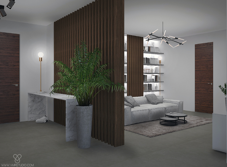 Мы использовали в интерьере монохромные цвета, в качестве акцента использовали мраморные плиты (можно удешевить керамогранитом под мрамор). Все двери в интерьере со скрытыми коробками, ниже Вы сможете познакомиться с несколькими ракурсами интерьера :)