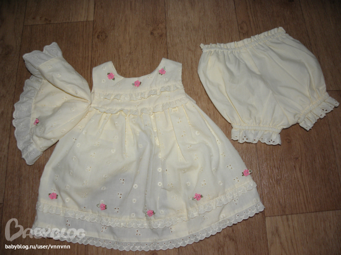 Комплект из 3 предметов (платье, шляпка и трусики), размер 12 мес, ОГ- 52 см,грудь- 27, длина (от плеча) - 40 см. ЦЕНА - 760