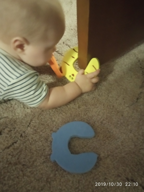 Играет почти во все игрушки, но предпочитает оранжевые, очень явно. Видимо любимый цвет. Обожает играть с целлофановыми пакетами. Целенаправленно ползет к полке где они лежат, разрывает весь ворох и самозабвенно играет по пол часа! Машет ими как пипидастрами - такой смешной! Вторая цель для доползания - стопоры на двери. Одела сразу три штуки на самый низ двери, чтобы он не ударился... но он любит их снимать по одной штуке и каждый грызть-сосать... Так и одеваю раз по 20 за день, а он снимает и по комнате раскидывает 😌