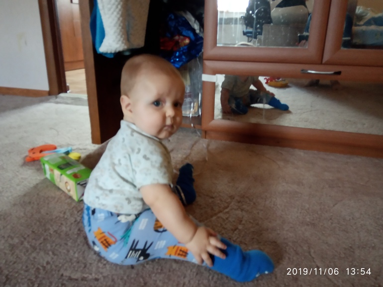 В принципе, оставлю как заметку на память... Сегодня (6 месяцев и 15 дней) после многих дней тренировки Тимыч всё-таки стал уверенно садиться сам. Правда сидит