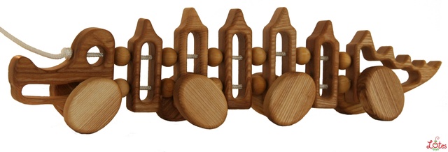 Как же я их люблю! Наша коллекция на днях пополнилась игрушками компании Лотестойз из Латвии. Качество супер, исполнение на высоте. Подарили на годик и три месяца ребенку крокодила и пирамидку. С крокодилом подружился сразу же! За счет того, что колесики у крокодила не круглые, а овальные, он так смешно вибрирует и извивается, когда его за веревочку за собой тянешь! Мишка мой в восторге! Причем звук не раздражает, что часто бывает у подобного рода игрушек, а наоборот, даже нравится. Дерево приятное на ощупь. Обработано льняным маслом. Хочу еще купить сыр для моторики, как на последнем фото.