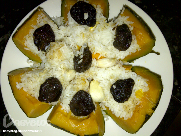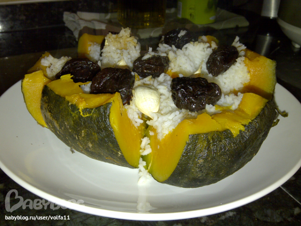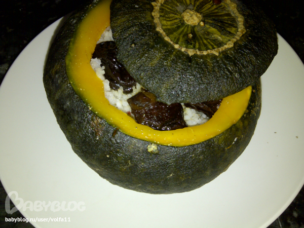 Как же тепло и хорошо на душе от такого блюда! Сегодня приготовила, и мы с сыночком на обед половинку съели. Тыковка фаршированная рисом, черносливом, чесночком, добавлено немножко маслица. Пока мы гуляли, она томилась в духовочке. А пришли, в доме стоял такой аромат. Мммм... А запивали мы все горячим напитком из шиповника.