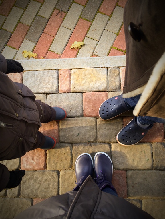 Да как-то без задумки все само получилось. Мы с мужем стояли, общались, Белла в коляске рядом сопела, а Мишка вокруг носился, а потом к нам подбежал и вот так встал. Я на айфон и сфоткала. У мужа, кстати, летние кроксы, потому что он покурить вышел, а я с детками как раз пришла с прогулки.