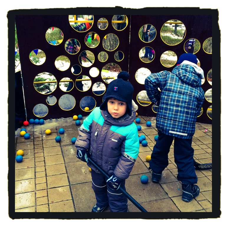 В-третьих, там, помимо классных детских площадок с кучей всяких качелей и лазилок, сделали немного детских развлечений: хоккей ( очень понравился Мишке моему), лыжи (тут погода подкачала, все почти растаяло), всякие кольца, которые надо забросить на палку, в общем, народ гуляет.