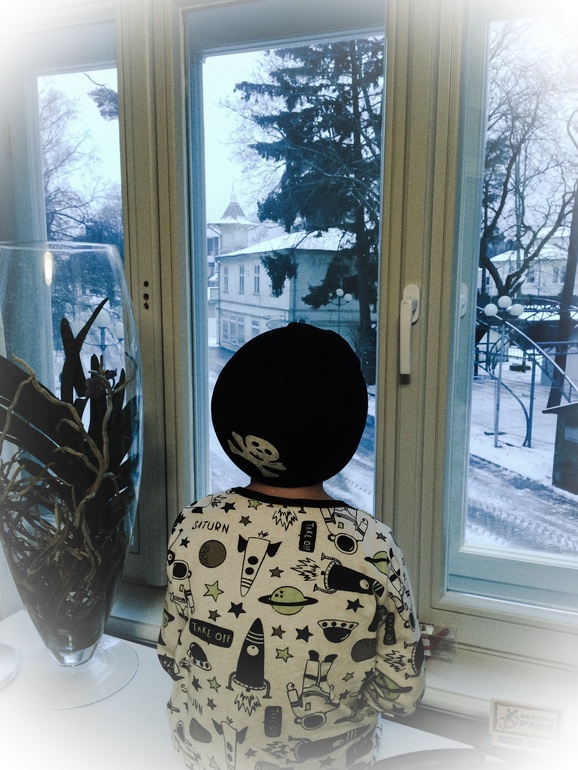 На самом деле он наблюдает да снегоуборочными машинами, которые утром чистили снег прямо под нашим окном. Непонятно только, зачем. Снова плюс, снова почти все растаяло.