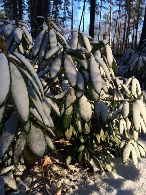 В парке было пусто. Мои шаги по снегу были первыми до того, как снег расчистил трактор. Анабелла сначала смотрела на сосны и небо, а потом уснула. Я же могла смотреть не только на сосны и ели, я увидела намного больше. Например, рододендроны в снегу.