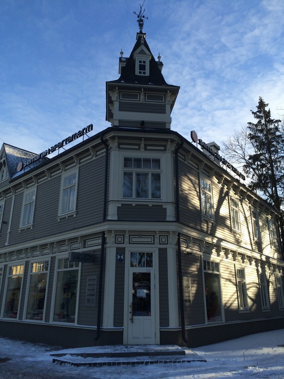 А это дом, в котором мы живем. Наша квартира на втором этаже. На первом магазин и ресторан. Боковое окно - Мишкина комната, а башня над ним, наша мансарда, которую оккупировал наш папа. К него там комп, большой телек, в общем, у нас в башне принц сидит;-)