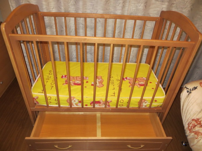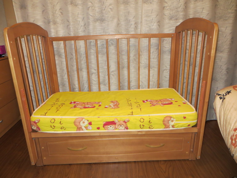 Кроватка Камилла (с ящиком), Можгинский лесокомбинат, цвет бук, ящик под днищем, с ортопедическим многослойным матрасом из кокоса, высота 13 см.В подарок мягкие бортики и 2 простыни на резинке.В оч.хорошем состоянии после одного ребенка, спал всего до 1,5 лет, перебрался к маме с папой)