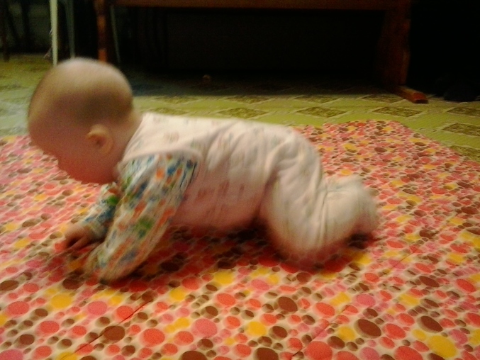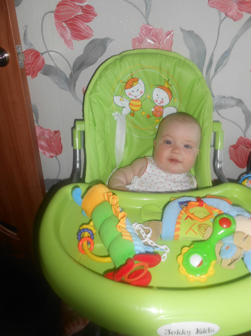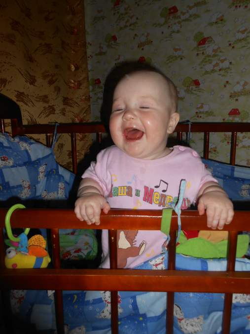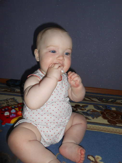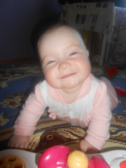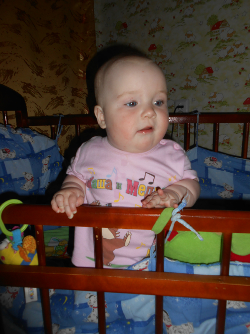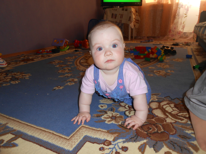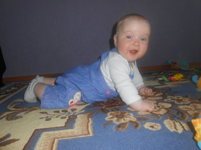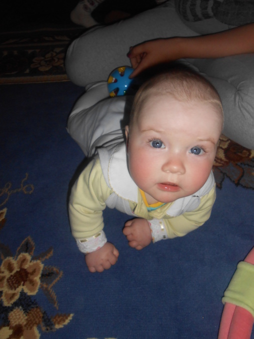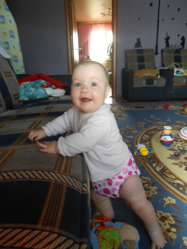 Ползает и играет.Не надо ее как сыночка таскала,носить на руках.Бабушка нас называет акселираткой))Просто вундеркинд какой-то!!!Спим не плохо,в 9-9.30 уходим в ночь,и покушать мы хотим 2 раза,спит отдельно.Правда тут видимо зубки беспокоили,был жуткий понос,и плакала по ночам.Ложила под утро к себе.Сейчас тьфу-тьфу,понос прошел,пропили хилак форте.Слюни как из ведра,в ожидании зубов,первых))Кушаем смесь гипоаллергенную Фрисо 2.Так и перевели нас на нее,аллергия снова дала о себе знать диатезом.Из пюре едим зеленые овощи,И зеленые фрукты,кашу.Сок не даю.Воду не плохо пьет.Гуляем много,сейчас вроде сидим не плохо в коляске)Раньше опмню совсем не хотела ни сидеть,ни лежать на прогулке.Укладываемся спать с пустушкой.Подгузники используем мало.Теперь перешли на многоразовые трусики-подгузники,просто меняем вкладыши.Подгузники же исползую только на улицу,и на ночь.