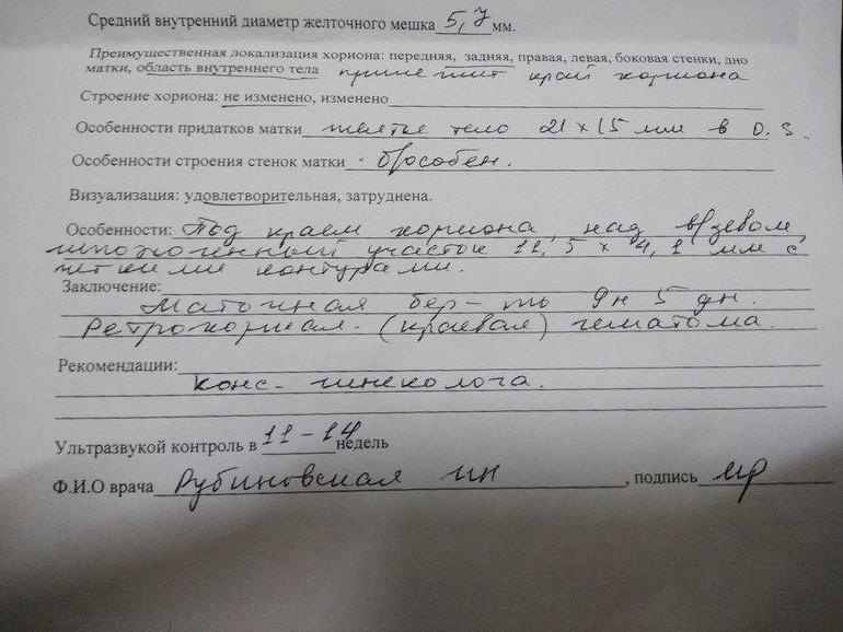 Ну как-то всё не очень у нас, вчера просто для себя сходила на УЗИ перед приемом сегодня, тетушка на УЗИ сказала, что гематома не большая иди с миром. Из ЖК направили в стационар, положили с диагнозом угрожающий аборт предварительно на 3 дня, добавили Дюфастон 3 раза в день и поставили капельницу (Первое фото это повторное УЗИ, второе-вчерашнее)