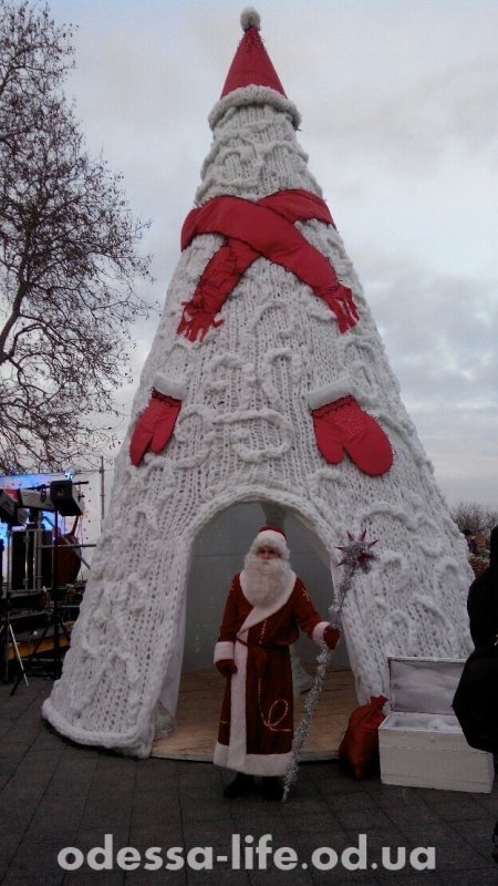 У памятника Дюку 25 декабря открылась арт-елка с выставкой, угощениями и Дедом Морозом внутри.