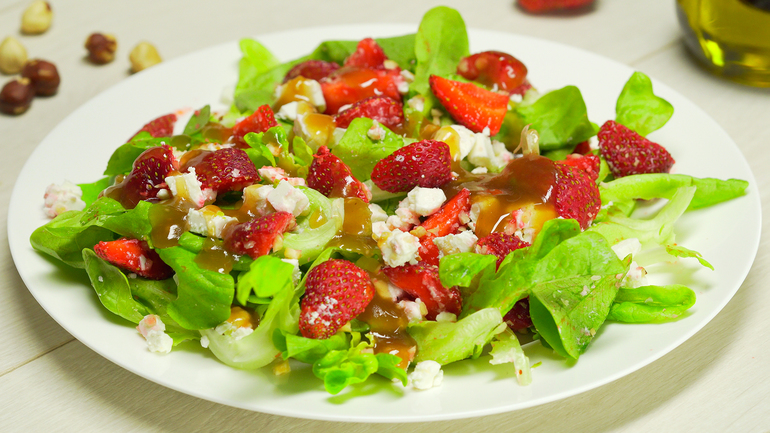 - Сверху выложить оставшуюся клубнику, сыр и орехи. Выложить салат в порционные тарелки и полить приготовленным соусом. Приятного аппетита!