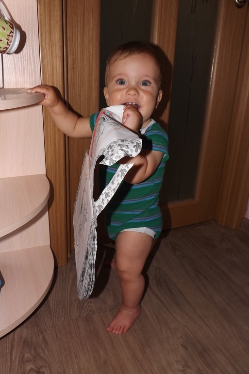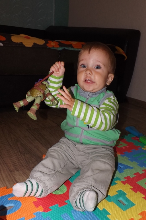 Теперь немного об умелках. Ну ползает, стоит, сидит - само собой. За одну ручку ходит пока неуверенно... Но я Сёму постоянно тренерую) Без поддержки не стоит. Зато к доли секунды разблокирует сенсорный телефон и выходи в интернет)))