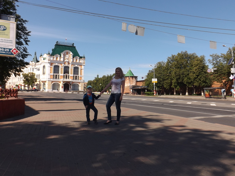 В Нижнем Новгороде я была лишь однажды. Проездом. Тогда меня поразили красоты двух могучих рек, от которых захватывает дух и сердце начинает биться чаще. И я пообещала себе, что вернусь туда обязательно, во что бы мне это ни стало... И вот, пришел этот час! Рано утром наша семья села в машину и выдвинулась в сторону Нижнего (это около 230 км). Солнце заливало все окружающее пространство, мальчики сладко посапывали на заднем сидении, а я находилось в счастливом предвкушении! "Долетели" очень быстро, каких-то 3 часа. Навигатор вел нас к площади Минина и Пожарского (там было решено бросить машину). Без труда нашли парковку на улице Алексеевской, перекусили и отправились покорять Нижний Новгород!)![]()