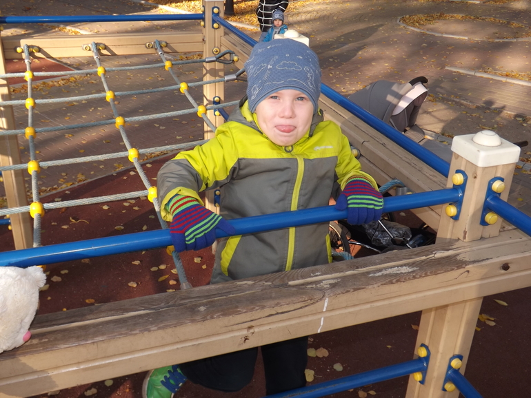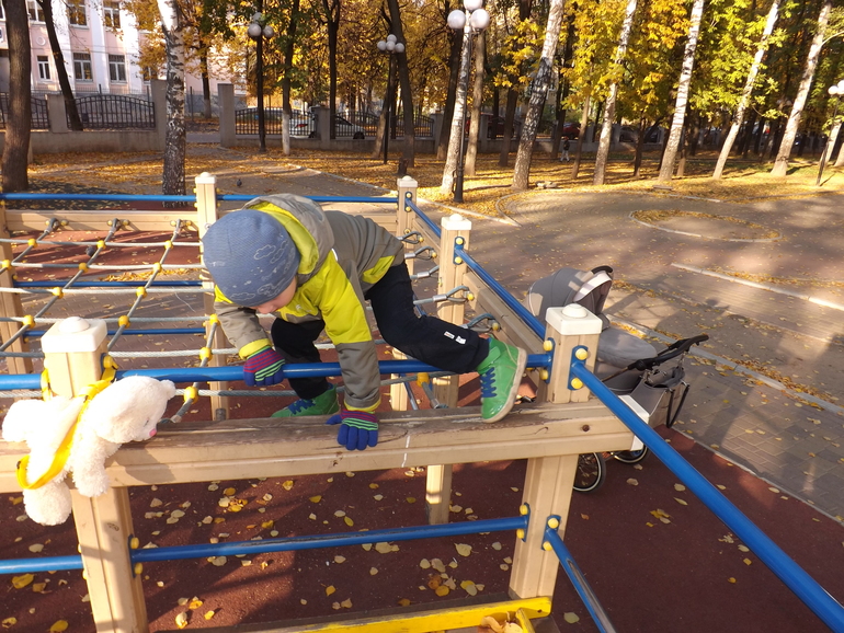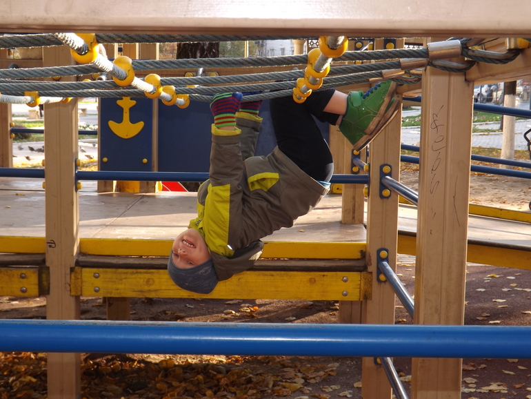 Любимое место на площадке - "лазилки". Висит кверхтормашками, не без падений, конечно, но тем не менее ловкости Денису не занимать