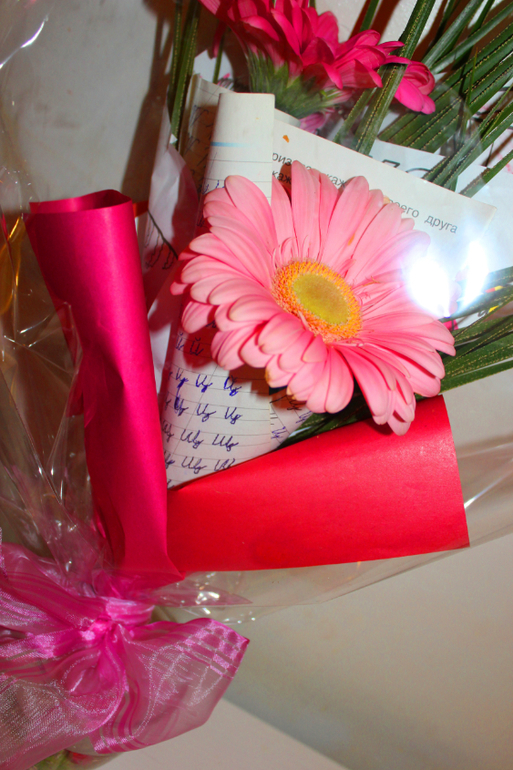 Про букет отдельная история. Его купил папа-ему продали веник одним словом. Пришлось переделать,ну и типа дизайнерский получился с прописями в личном исполнении дочери)