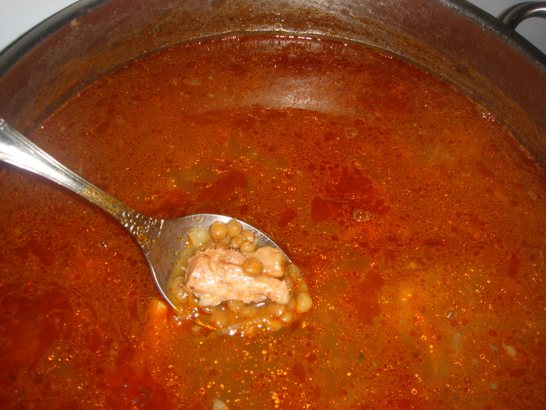 тоже обожаю!мы варим до полного растворения чечевицы, или через сито протираю (этоу мужа на родине так принято) получается густой однородный суп,на говяжем бульоне, все тоже самое, только без картошки и мяса)