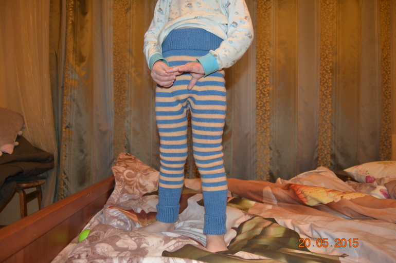 Полосатые достались старшему. Они тоже очень мягкие. Получились Уже коричневых, идеальный вариант поддевы. То что я хотела. Также предусмотрена возможность вставить резинку. Манжеты облегают щиколотку хорошо. Вверх подниматься не будут. Сыну сейчас 2 г.10мес., вес около 14 кг, рост около 100 см.