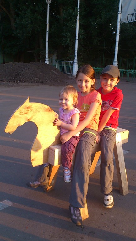 В Парк Горького мы успели създить 2 раза еще до карнавала на буднях - там супер! Посмотрели оленей, кроликов, птичек и прочую живность в мини-зоопарке в Нескучном саду (а также на пугливых белок в самом парке). Дети порезвились на хороших детских площадках (особенный успех у старших и Ксюши имели лежачие качели, а Лиса как обычно засела в песочнице). Жаль, что до Панда-Парка дети пока не доросли, там от 140см... еще годик старшим подождать нужно... Нашли классный а главное бесплатный батут, дети напрыгались вволю за два дня. Погуляли по набережной, перекусили горячей кукурузой (Лиса - фанат, как выяснилось), посмотрели на вечерний парк - фонарики, цветы, романтичные аллеи.. Только с прокатом нам не очень повезло - хотели взять велики, а детских сидений у них нет =( Есть только прицепы странной конструкции, но Лиса в них залезать отказалась. Так что ножками гуляли.