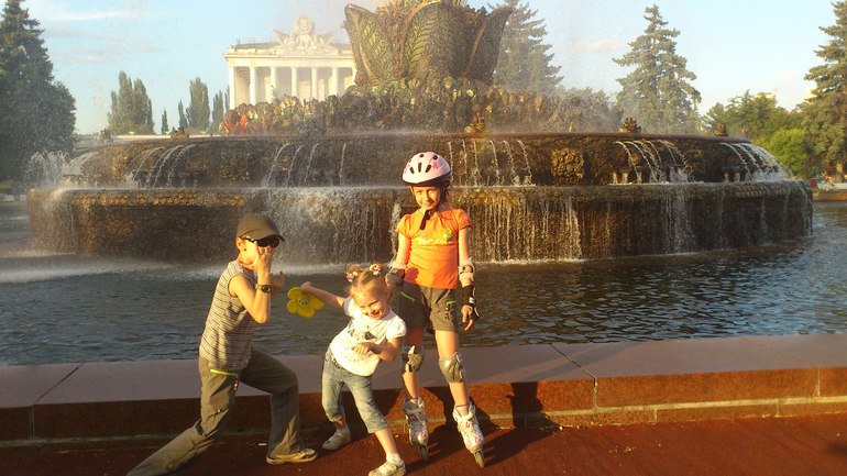 На прошлых выходных гуляли с друзьями на ВВЦ - все 4-5 часов прогулки мы с Алиной провели на роликах. Лиса каталась в основном в коляске, немного на папином самокате (у самой пока не очень получается, хотя пытается отталкиваться ногой - так что ее катал папа) и со мной (на руках). Тур катался на самокате (после предудего падения ролики пока одевать не решается). Было много детей с самокатами и взрослых на колесах (велики/ролики). Позитивно провели время =) Перед поездкой дети настояли на выпечке, так что мы там всех угощали приготовленным ими печеньем. В целом, гулять на роликах с коляской и Алей вполне неплохо, главное добратьсяи до места с ровным асфальтом и без машин. А чтобы избежать толпы на ВВЦ, можно уйти от фонтанов за повильон Космос, к павильону Мясной промышлености - там тихо, хорошие дорожки для катания и никого нет, мы там уже не первый год катаемся...