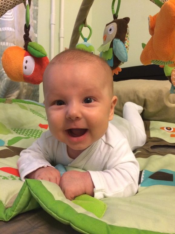 Умелки: понравилось лежать на животе, осваиваем коврик. Научился переворачиваться с живота на спину (обратно пока не получается), активно крутится (на 180 разворачивается в кровати), игрушку держит (но пока не долго), во время бодрствования на прогулках предпочитает коляске кенгурушку. Много улыбается и гулит. Ночью спит 4-6 часов между кормлениями. Любит купаться - осваиваем большую ванну :)