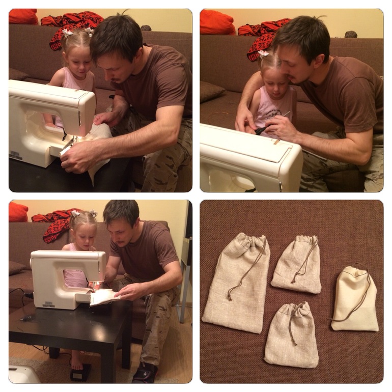 Алиса активно участвовала - нажимала на педаль, продергивала проволоку, чтобы вставить веревку, отрезала нитки и всячески помогала. Муж собирался сшить один мешочек для дайсов, но Лиса напросилась в помощники и ей так понравился процесс, что они сшили еще 3 штуки.