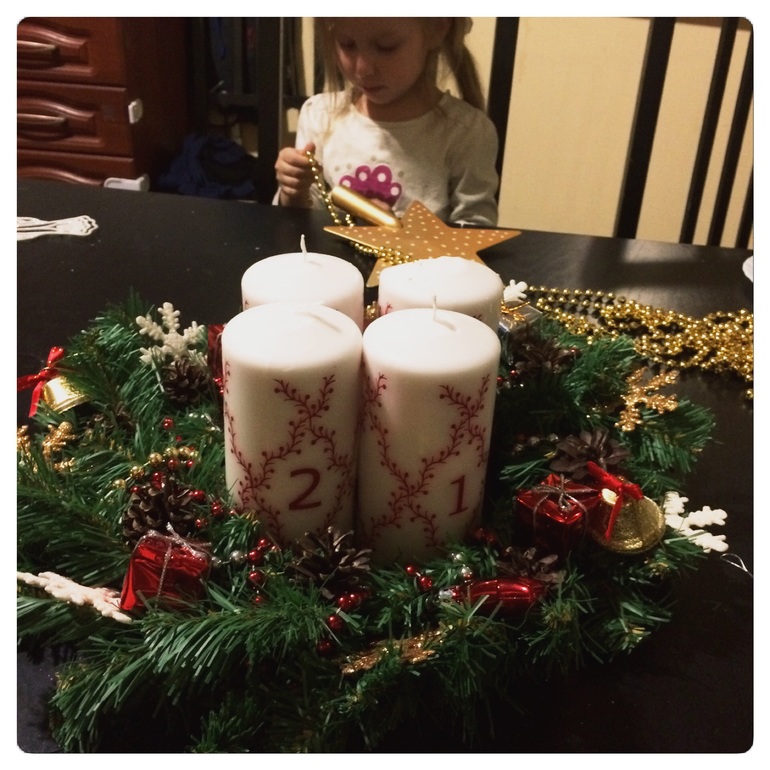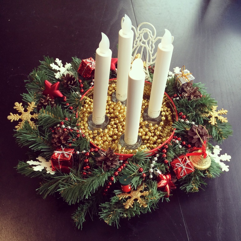 Для этого нам потребовались: 4 свечи (икея), скрученная в венок часть елочной гирлянды (не успели купить заготовку), шишки (остались от осенних поделок, немного мелких елочных украшений и бус, клеевой пистолет, банка из под печенья (в нее поставили свечи + жесткий каркас для венка), дети и немного энтузиазма.