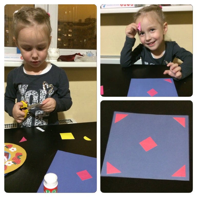 У неё когда как получается - то ровно, то край ободран.. Для аппликаций большую часть вырезаю я (так и написано "попроси родителей вырезать", так что я после работы развлекаюсь теперь вечерами), но она любит резать, поэтому ей тоже даю бумажки или простые элементы. Квадрат, например, на треугольники она аккуратно разрезать сможет, а детали для снеговика - нет.