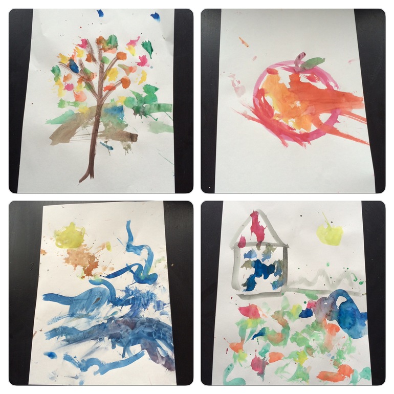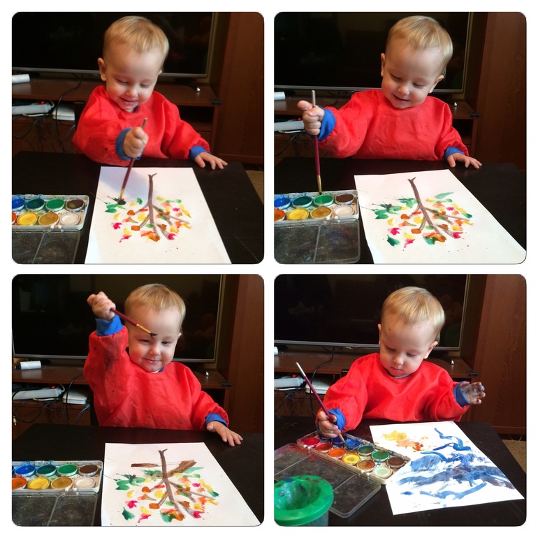 Он в основном "плюхал" кисточкой по листу или размазывал руками, а я придавала этому "сюжет", предлагая взять подходящий цвет, рисуя ствол/контур яблока/дом и т.п. - получилось забавно :)
