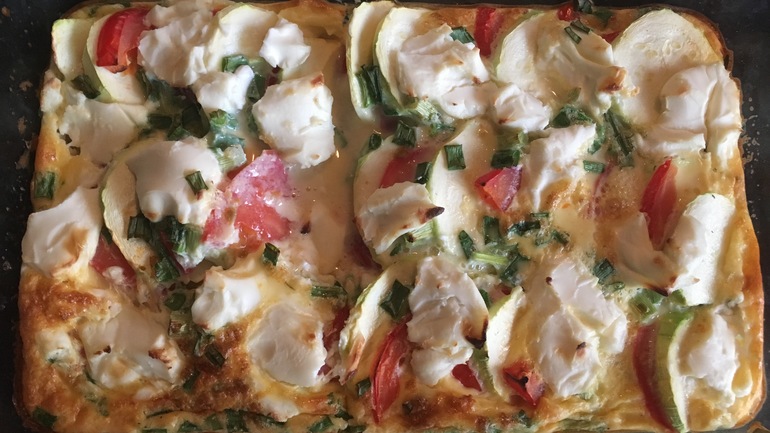 На маленький противень (27*18см) ушёл 1 кабачок, 3 помидора, пара веточек зеленого лука, один средний шарик творожного сыра, 3 яйца и немного молока - это порция на двоих. На большой противень (25*35см) удвоить количество продуктов - этого уже на всю семью хватит :)