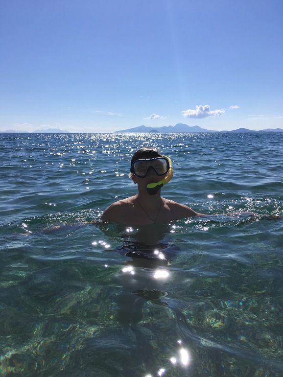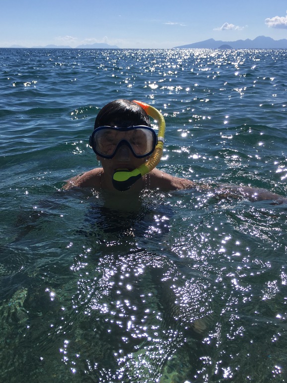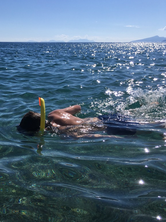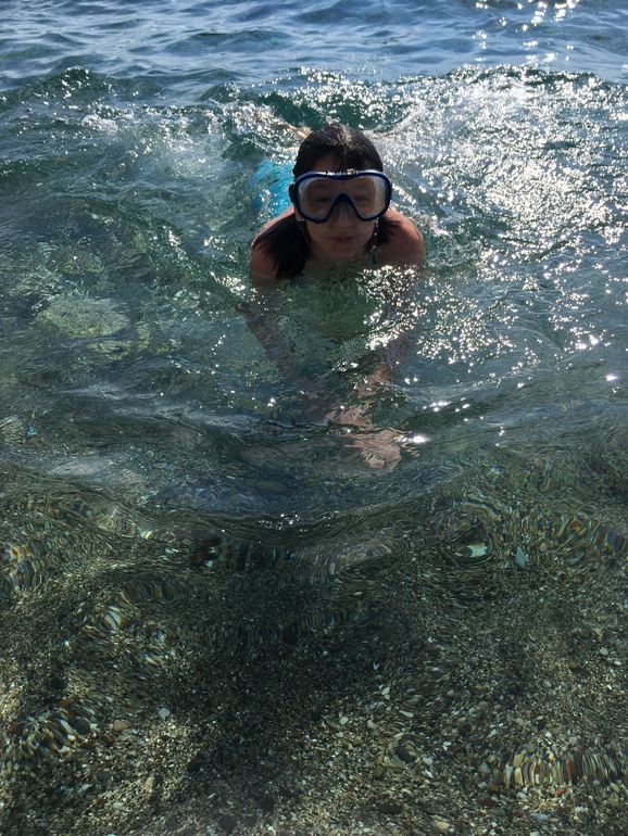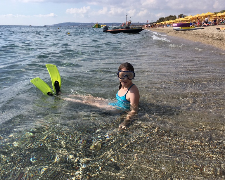 Вода чистая и прозрачная, много рыбок прямо у берега. Старшие плавали в основном в масках или очках - смотрели рыбок, собирали камни и ракушки.