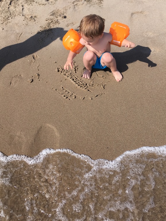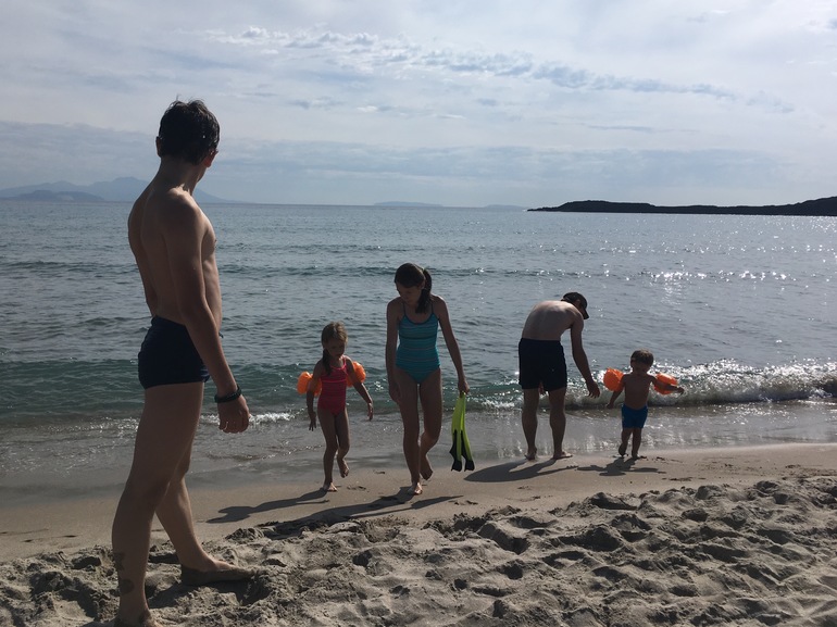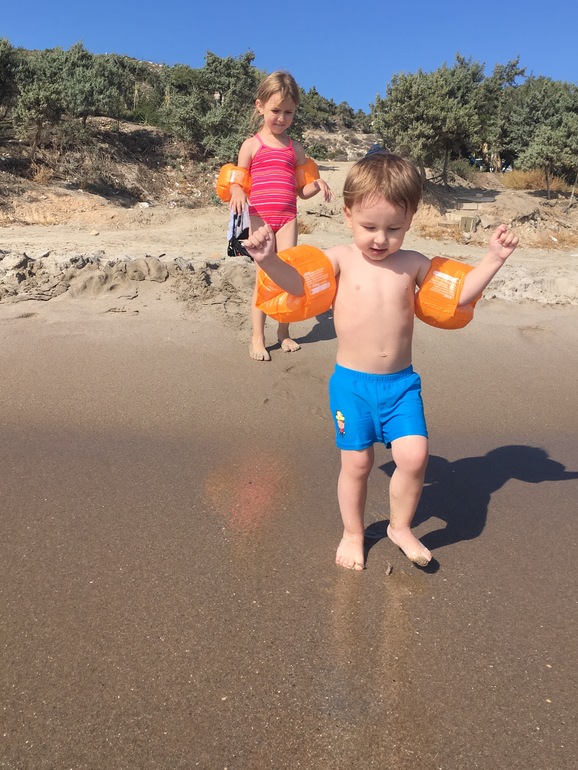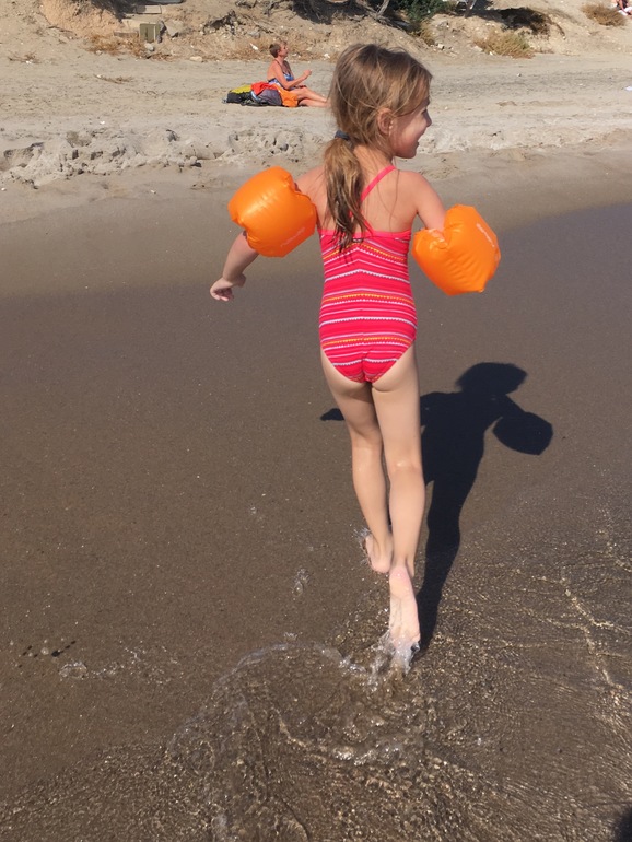 Искупаться можно, детям понравилось бегать от волн (в Кардамене почти все время был штиль, а тут хоть какие-то волны), и на песке имена писали. Заход в море для младших детей конечно самый удобный - ближайшие 30 метров от берега Лисе по пояс, Берту по плечи, хочешь бегай, хочешь плавай. Вода по температуре такая же, как в Кардамене.