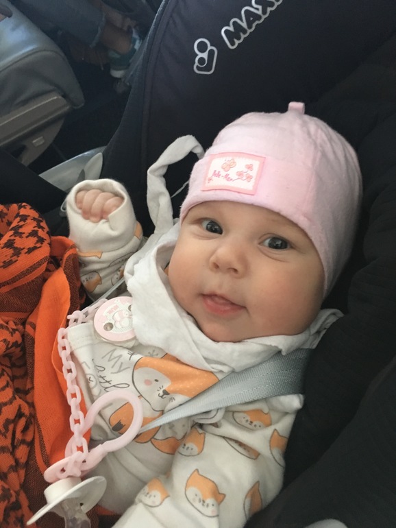 Малышка спала, улыбалась, общалась, пару раз поела (при взлёте и перед посадкой) и один раз ее успели переодеть. Большую часть времени она располагалась в автокресле, которое я разместила рядом с собой - это гораздо удобней, чем держать на руках весь полет.