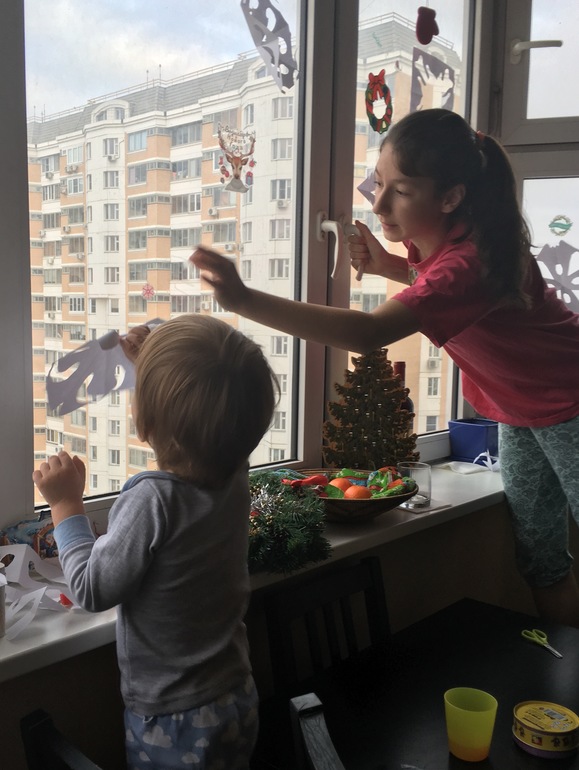 Пока ждали, когда же все проснутся, слегка перекусили и решили украсить окна (Айка у нас массовик-затейник)
