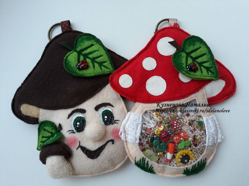 Сувениры и подарки ручной работыИгрушки выполнены из мягкого фетра, внутри наполнитель - бисер, стразы и пайетки, деревянные цветные бусины, пуговки на детскую тематику.